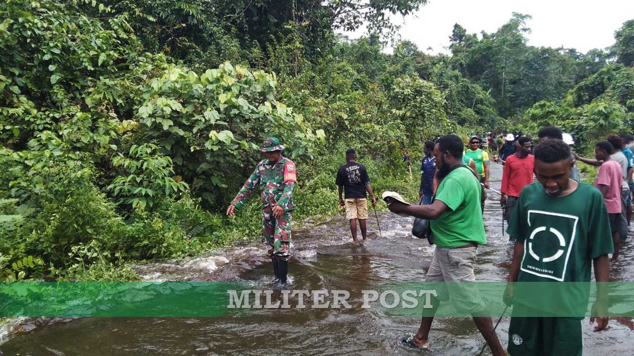Timika – Militer Post | Sertu Yulius Nampe, Babinsa Koramil 1710-07/Mapurujaya bersama warga binaan di Kp. Tipuka, Distrik Mimika Timur, Kab. Mimika bergotong royong dan bahu membahu dalam upaya membersihkan jalan akibat banjir yang menggenangi jalan agar air cepat surut, pada Sabtu (10/08/2024).